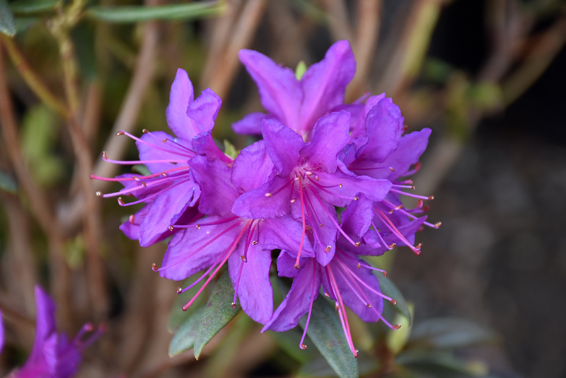 A compact, evergreen shrub featuring vibrant purple flowers with fuchsia throats and stripes, and violet spots; narrow dark green foliage is twisted and rolled; must have well-drained, highly acidic and organic soil, use plenty of peat moss when planting