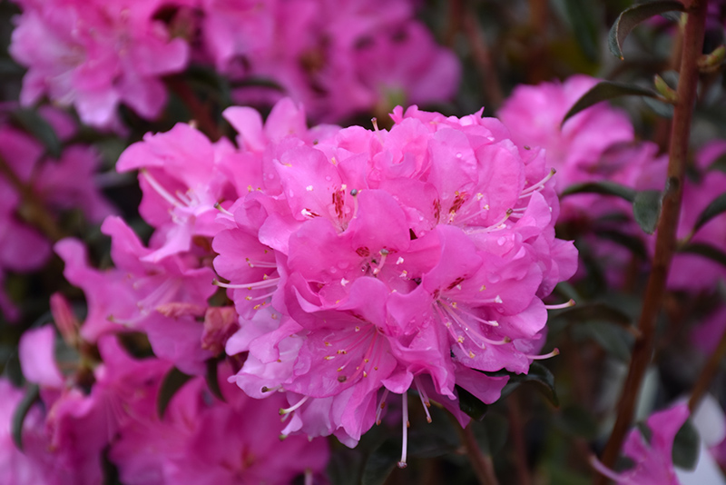 First Date Rhododendron features showy clusters of hot pink trumpet-shaped flowers with red spots at the ends of the branches from early to mid spring. It has dark green evergreen foliage. The small twisted narrow leaves remain dark green throughout the winter.