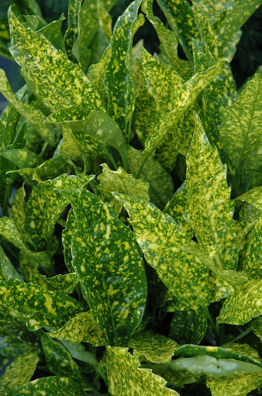 Variegated Japanese Aucuba has attractive yellow-spotted dark green foliage on a plant with a round habit of growth. The glossy pointy leaves are highly ornamental and remain dark green throughout the winter.